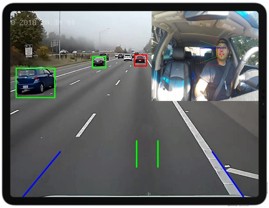 Road facing AI: Stop sign violation, FCW, Tail gating, Speed violations and Lane Drift Driver facing AI: Distraction, Drowsiness, Face ID